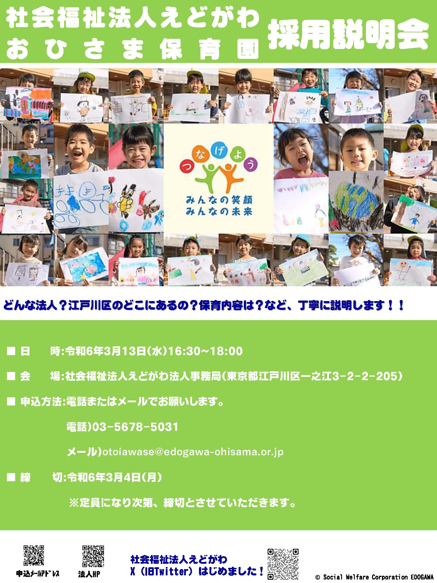 2024.02.15 採用情報 採用説明会を開催します 3月13日に採用説明会を開催します。 社会福祉法人えどがわ おひさま保育園に興味がある 保育園に興味がある方は、 気軽に参加してくださいね。 参加締切は3月4日です。 詳しくはこちら お知らせ一覧へ戻る