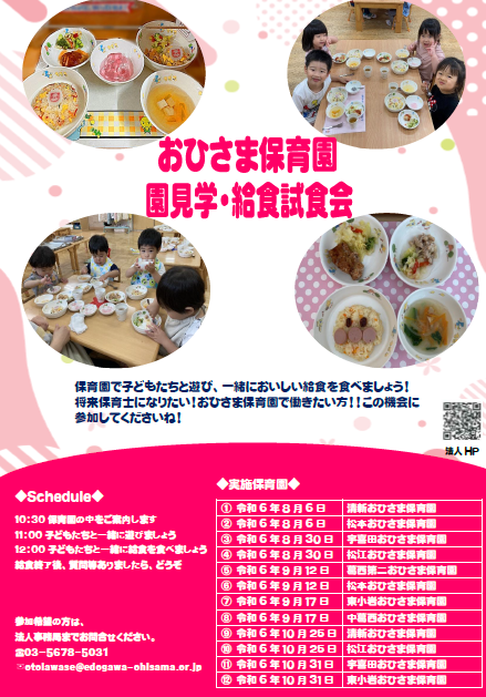 2024.07.11 採用情報 園見学・給食試食会を行います 園見学・給食試食会を開催します。 将来、保育士になりたい!おひさま保育園で働きたいみなさん、 ぜひ参加してくださいね 。 詳しくはこちら お知らせ一覧へ戻る